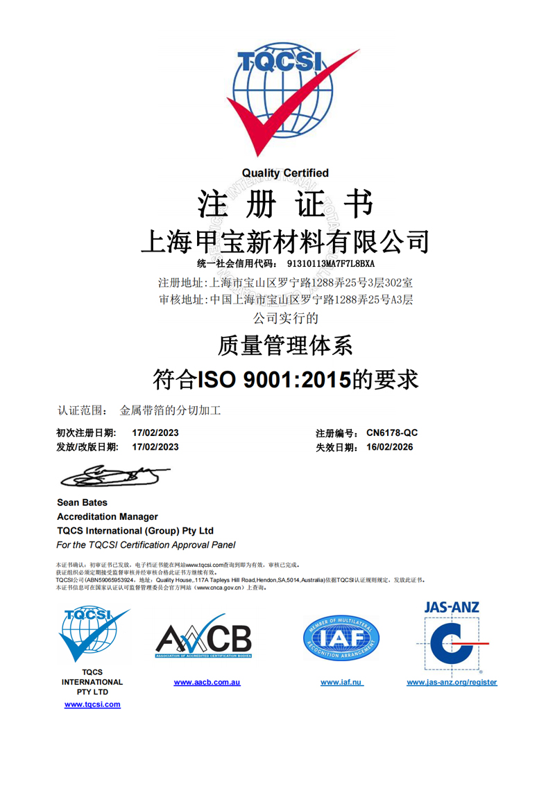 甲寶金屬材料(上海)有限公司主要從事于高精密、高性能、超薄材料的研發、生產、銷售。致力于新技術、新材料的研發和推廣應用,產品廣泛應用于電子電器、電子屏蔽、航空航天、智能汽車、醫療器械、能源裝備、石墨烯、鋰電池、5G通訊等領域。